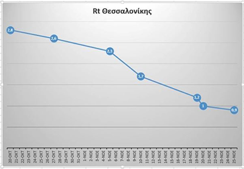 Πέραν αυτού, έκπληξη δημιουργεί το γεγονός ότι ο δείκτης Rt ήταν στη Θεσσαλονίκη στο δυσθεώρητο 2,8 (κατά μέσο όρο ένα κρούσμα μολύνει 2,8 άτομα ακόμη, ισχυρότατη ένδειξη καλπάζουσας εξάπλωσης) στις 20 Οκτωβρίου, ενώ η πόλη μπήκε σε καθολικό lockdown…14 μέρες αργότερα, όπως προκύπτει από διάγραμμα που έχει ήδη δημοσιεύσει το iatronet.gr.