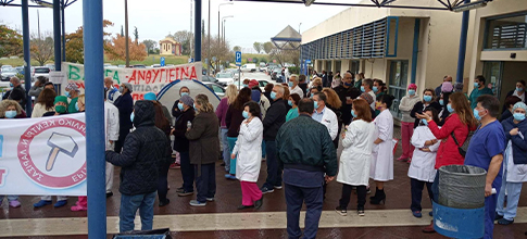 Δεκάδες εργαζόμενοι στο νοσοκομείο βγήκαν στον χώρο της διαμαρτυρίας την Παρασκευή για να δηλώσουν τη συμπαράστασή τους στον απεργό πείνας και να διαμαρτυρηθούν για τις συνθήκες εργασίας τους. Στα τρία αιτήματα του τραυματιοφορέα πρόσθεσαν την ενίσχυση του ιατρικού και νοσηλευτικού προσωπικού με άμεσες προσλήψεις, καθώς και την ένταξη του ιδιωτικού τομέα με στόχο την αποσυμφόρηση των δημόσιων νοσοκομείων. Όπως είπαν, οι κλινικές Covid βρίσκονται στα όριά τους, με ελάχιστα διαθέσιμα κρεβάτια και μη επαρκή προσωπικό για όσους νοσηλεύονται, ενώ το σύνολο των 18 κλινών ΜΕΘ είναι πλήρεις και προσεύχονται καθημερινά να μην υπάρξει άλλο περιστατικό που να χρήζει διασωλήνωσης.