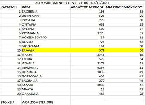 Για την ακρίβεια, με βάση τα στοιχεία του Worldometers, Η Ελλάδα βρίσκεται με δεδομένα της 8ης Δεκεμβρίου, στην 10η θέση της Ευρωπαϊκής Ένωσης των "27", όσον αφορά στους διασωληνωμένους, ανά εκατομμύριο πληθυσμού, με την Γερμανία να είναι στην 15η θέση και τη Γαλλία στην 18η, με ό,τι αυτό συνεπάγεται σε σχέση και με τη δυναμικότητα των αντίστοιχων συστημάτων Yγείας.