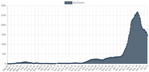 Το ακόλουθο γράφημα απεικονίζει των κινητό μέσο όρο 7 ημερών των επίσημα διαγνωσμένων κρουσμάτων στην Ελλάδα, από την αρχή της πανδημίας. Με βάση τα χθεσινά στοιχεία, ο κινητός μέσος όρος των 7 τελευταίων ημερών είναι στα 1.450 κρούσματα ημερησίως.