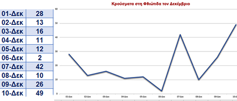 Σύμφωνα με στοιχεία του Εθνικού Οργανισμού Δημόσιας Υγείας (ΕΟΔΥ), στη Φθιώτιδα καταγράφηκαν χθες 49 κρούσματα. Όπως φαίνεται στον παρακάτω πίνακα, η τάση στην περιοχή είναι αυξητική τις τελευταίες 10 μέρες.