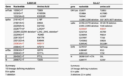Αριστερά, είναι το στέλεχος της Νότιας Αφρικής και δεξιά το στέλεχος του Ηνωμένου Βασιλείου. Το μόνο κοινό που έχουν είναι η περίφημη μετάλλαξη Ν501Υ, ενώι φαίνεται να έχουν περάσει εξελικτικό "άλμα".