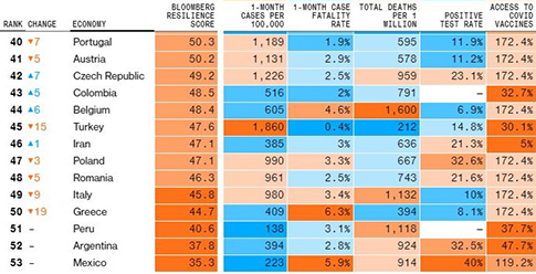 Εκτός από τη χώρα μας, μεγάλη πτώση στην κατάταξη του Bloomberg σημείωσαν επίσης οι ΗΠΑ (-19 θέσεις), η Τουρκία (-15 θέσεις), η Ινδονησία (-13 θέσεις) και η Γερμανία (-7 θέσεις). Στον αντίποδα, η Γαλλία κατέγραψε άνοδο 11 θέσεων, όπως και οι Φιλιππίνες και η Νιγηρία, ενώ άλμα 13 θέσεων πραγματοποίησε το Ιράκ.