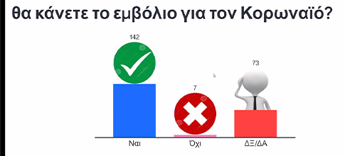 Στη δεύτερη ερώτηση, για το αν θα κάνουν το εμβόλιο του κορωνοϊού, οι 142 από τους 222 που απάντησαν στη λήξη του σεμιναρίου είπαν πως θα το κάνουν. Οι 7 απάντησαν όχι, ενώ 73 επέλεξαν το Δεν ξέρω/Δεν απαντώ, σημαντικά λιγότεροι από όσος είχαν τηρήσει αυτή τη στάση στην αρχή του σεμιναρίου.