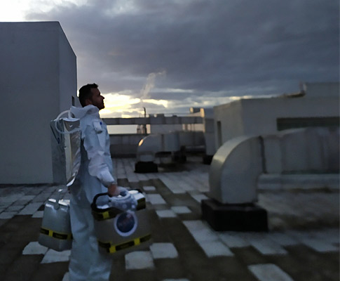 Η ίδια εργάζεται ως μαία και χρειάζεται σχεδόν σε κάθε εφημερία της να φορά την προστατευτική στολή, όπως και ο «Σπύρος» της παράστασης, ο Βάιος Λιάππης, που είναι νοσηλευτής χειρουργείων. Για τις ανάγκες του θεατρικού, οι ολόσωμες φόρμες στολίστηκαν με αυτοκόλλητα σήματα της NASA, προστέθηκε ο διαστημικός εξοπλισμός και η παράσταση άρχισε, στο σαλονάκι της Παιδιατρικής και Παιδοχειρουργικής Κλινικής.