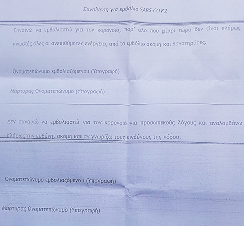 Στο έγγραφο - που παρατίθεται πιο κάτω - αναφερόταν πως "συναινώ να εμβολιαστώ για τον κορονοϊό, παρ' όλο που μέχρι τώρα δεν είναι γνωστές όλες οι ανεπιθύμητες ενέργειες από το εμβόλιο ακόμη και θανατηρόρες" (σ.σ. προφανώς θανατηφόρες)...