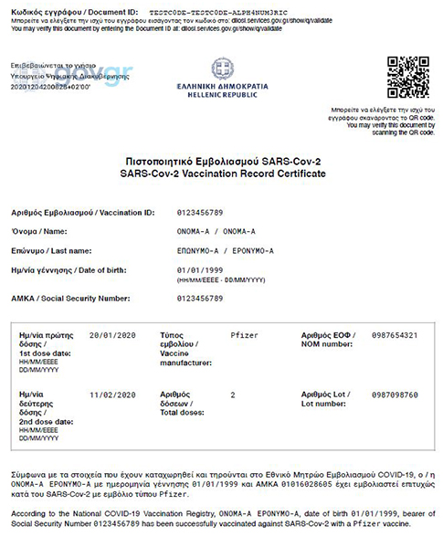 Στο έγγραφο, που παρατίθεται πιο κάτω, περιλαμβάνονται το ονοματεπώνυμο του εμβολιασθέντα, η ημερομηνία γέννησής του και ο ΑΜΚΑ.
