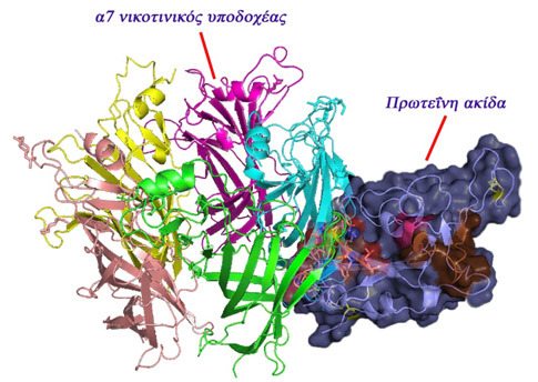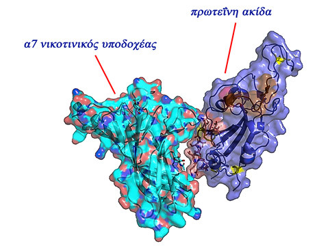 Στιγμιότυπα αλληλεπίδρασης μεταξύ του α7 νικοτινικού υποδοχέα του αντιφλεγμονώδους χολινεργικού συστήματος και της πρωτεΐνης-ακίδας του κορωνοϊού SARS-CoV-2 (7).