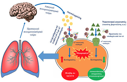Αλληλεπίδραση μεταξύ χολινεργικού αντιφλεγμονώδους συστήματος (α7 νικοτινικών υποδοχέων) και κορωνοϊού SARS-CoV-2. O ιός εμποδίσει την επαφή της ακετυλοχολίνης με τον α7 υποδοχέα, με αποτέλεσμα τη δυσλειτουργία των υποδοχέων, τη διαταραχή της ισορροπίας του ανοσοποιητικού συστήματος και την υπερ-φλεγμονώδη απάντηση. Φαρμακευτικοί νικοτινικοί αγωνιστές (νικοτίνη, βαρενικλίνη, κ.α.) θα μπορούσαν να προστατεύσουν τους α7 υποδοχείς και να αποκαταστήσουν την ισορροπία του ανοσοποιητικού συστήματος, καταστέλλοντας την υπερ-φλεγμονή (7).