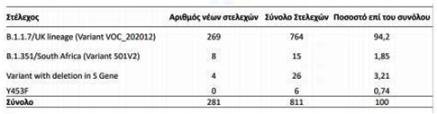Από τα 281 στελέχη τα 269 βρέθηκαν με τη μετάλλαξη Β.1.1.7/UK lineage (VariantVOC_202012), 8 στελέχη βρέθηκαν με τη μετάλλαξη LineageB.1.351/South Africa (Variant501V2) και 4 ακόμη με μετάλλαξη, η οποία δεν αξιολογείται ως σοβαρή.