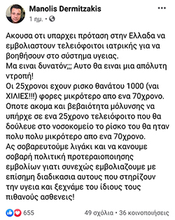 Με μια ανάρτησή του σε ιδιαίτερα υψηλούς τόνους, τη Δευτέρα, ο καθηγητής Γενετικής στο Πανεπιστήμιο της Γενεύης, Μανώλης Δερμιτζάκης (φωτογραφία κάτω), διατύπωσε την έντονη διαφωνία του στην πρόταση να εμβολιαστούν οι τελειόφοιτοι φοιτητές της ιατρικής στην Ελλάδα, ώστε να βοηθήσουν στο σύστημα Υγείας. "Μα είναι δυνατόν; Αυτό θα είναι μια απόλυτη ντροπή!", έγραψε στον προσωπικό του λογαριασμό στο Facebook, τονίζοντας πως οι 25χρονοι έχουν ρίσκο θανάτου χίλιες φορές μικρότερο από έναν 70χρονο. "Οπότε ακόμα και βεβαιότητα μόλυνσης να υπήρχε σε έναν 25χρονο τελειόφοιτο που θα δούλευε στο νοσοκομείο, το ρίσκο του θα ήταν πολύ πολύ μικρότερο από έναν 70χρονο", τόνισε και κατέληξε: "Ας σοβαρευτούμε λιγάκι και να κάνουμε σοβαρή πολιτική προτεραιοποίησης εμβολίων, γιατί συνεχώς εμβολιάζουμε με επίσημη διαδικασία αυτούς που στηρίζουν την Υγεία και ξεχνάμε τους ίδιους τους πιθανούς ασθενείς".