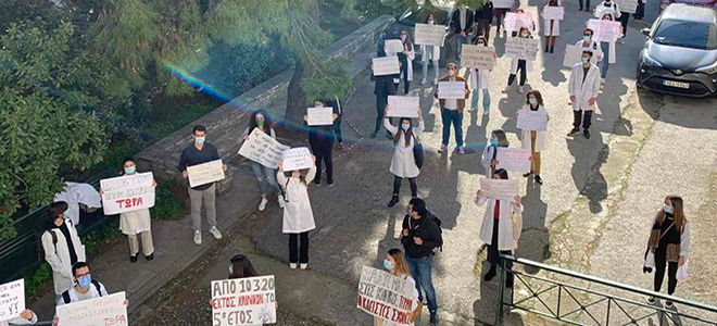 Το προηγούμενο διάστημα, φοιτητές των δύο τελευταίων ετών σε ιατρικές σχολές της Αθήνας και της περιφέρειας, με μπροστάρηδες τους πεμπτοετείς, βγήκαν στους δρόμους, διαμαρτυρόμενοι για τον πολύμηνο αποκλεισμό τους από την κλινική άσκηση. "Γιατρός χωρίς κλινική άσκηση. Θα με εμπιστευόσουν;", έγραφε ένα από τα πλακάτ "Η θέση μας είναι δίπλα στον ασθενή, όχι μπροστά στον υπολογιστή", ένα άλλο. Προβάλλοντας ως παραδείγματα τις στρατηγικές άλλων χωρών, όπως η Γαλλία, όπου οι κλινικοί φοιτητές όχι μόνο δεν απομακρύνθηκαν από τις κλινικές, αλλά εκπαιδεύτηκαν μέσα στη μάχη με την πανδημία, ζήτησαν να επιστρέψουν στον φυσικό τους χώρο, να μάθουν να συνυπάρχουν με τον COVID στη διάρκεια της εκπαίδευσης, να τους δοθούν μέσα ατομικής προστασίας, να γίνονται διαγνωστικά τεστ ανά τακτά διαστήματα, αλλά και να εμβολιαστούν κατά προτεραιότητα για την προστασία των ίδιων και των οικογενειών τους.