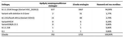 Συνολικά, έχουν ταυτοποιηθεί 1.667 θετικά για την παρουσία μετάλλαξης Β.1.1.7/UK lineage (Variant VOC_202012) και 48 θετικά για την παρουσία μετάλλαξης B.1.351/South Africa (Variant 501V2) από την έναρξη λειτουργίας του Εθνικού Δικτύου Γονιδιωματικής Επιτήρησης για τις μεταλλάξεις του SARS- CoV-2 έως σήμερα.