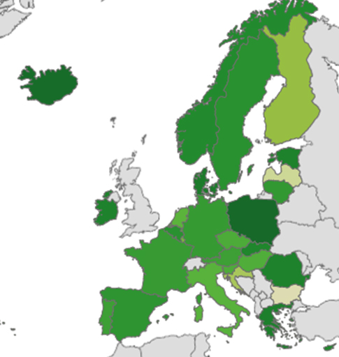 Τα χαμηλότερα ποσοστά καταγράφονται στη Βουλγαρία (0,8%), στη Λετονία (1,1%) και στην Κροατία (1,6%).
