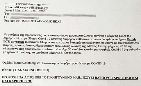 Με έγγραφό της, που παρατίθεται πιο κάτω, η επιτροπή διαχείρισης του υπουργείου ζητεί από το νοσοκομείο να υποδείξει (μέχρι σήμερα) 30 νοσηλευόμενους non CoViD ασθενείς, οι οποίοι μπορούν να διακομιστούν ("διακομίσημοι" είναι η έκφραση που χρησιμοποιείται).