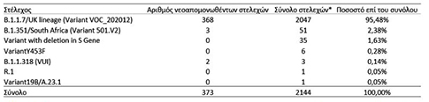 Από τα 371 δείγματα με στελέχη VOC, τα 368 βρέθηκαν με τη βρετανική μετάλλαξη Β.1.1.7/UK lineage (Variant VOC_202012) και 3 δείγματα με τη νοτιοαφρικανική μετάλλαξη Lineage B.1.351/South Africa (Variant 501.V2)