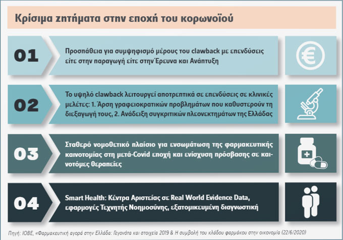 - Ο τρίτος πυλώνας αφορά στην επαναξιολόγηση του μηχανισμού επιστροφών (clawback), του οποίου το συνεχώς και ανεξέλεγκτα αυξανόμενο ύψος αποτελεί βασική απειλή της βιωσιμότητας του συστήματος. Όπως σημείωσαν οι εκπρόσωποι του Συνδέσμου, ο σημερινός μηχανισμός διαιωνίζει τις παθογένειες, αφού απλώς μετακυλίει το κόστος στις φαρμακευτικές επιχειρήσεις.