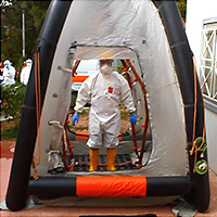 Διαδικασία απολύμανσης έξω από τον χώρο καραντίνας για τους διασώστες.