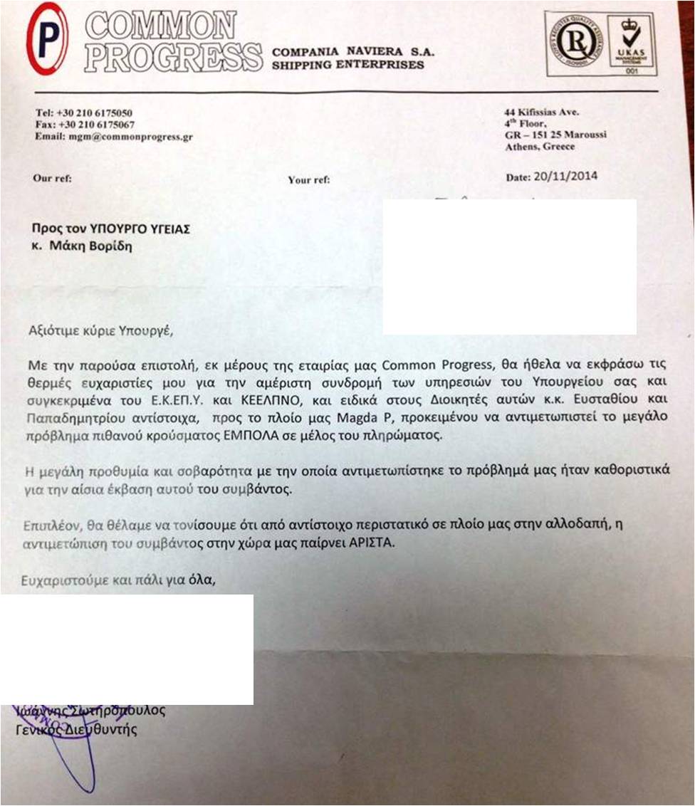 Με επιστολή προς τον υπουργό Υγείας (παρατίθεται ολόκληρη πιο κάτω), οι υπεύθυνοι της εταιρείας “Common Progress” αναφέρουν χαρακτηριστικά ότι “...από αντίστοιχο περιστατικό σε πλοίο μας στην αλλοδαπή, η αντιμετώπιση του συμβάντος στη χώρα μας παίρνει άριστα”...