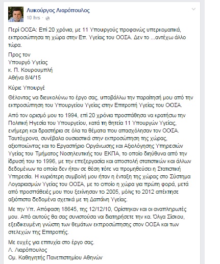 “Επί 20 χρόνια, με 11 υπουργούς, προφανώς υπερκομματικά, εκπροσώπησα τη χώρα στην Επ. Υγείας του ΟΟΣΑ. Δεν το...αντέχω άλλο τώρα”.
