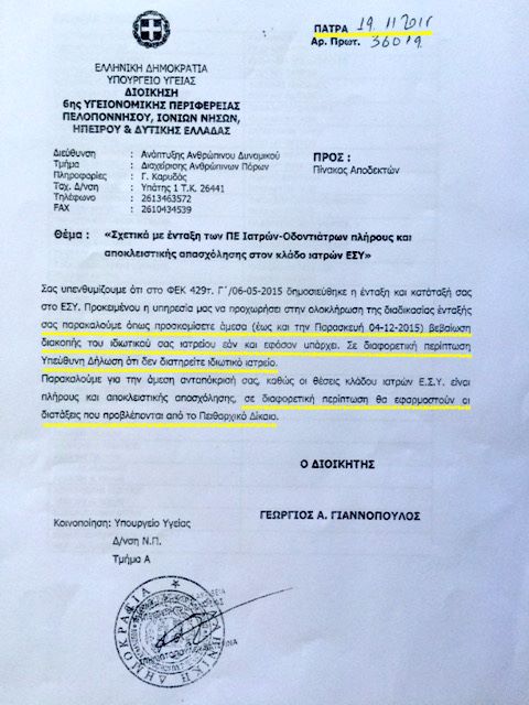 Με έγγραφό του, το οποίο παρατίθεται ολόκληρο πιο κάτω, ο διοικητής της ΥΠΕ ζητεί από τους εν λόγω γιατρούς να του καταθέσουν έως τις 4 Δεκεμβρίου βεβαίωση διακοπής λειτουργίας του ιδιωτικού τους ιατρείου.