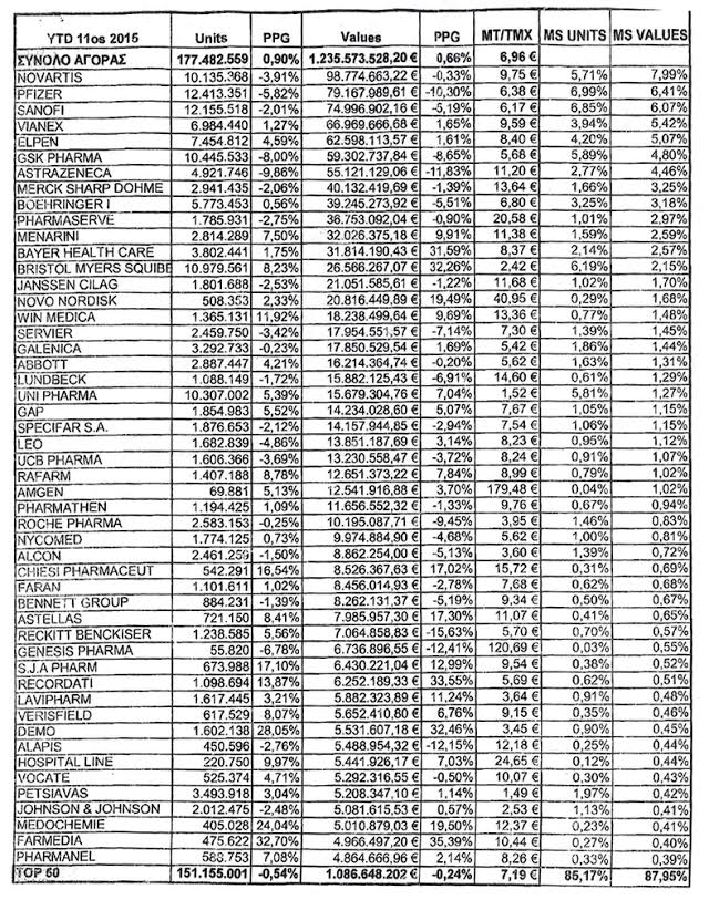 Σημαντική παρουσία, ωστόσο, ανάμεσα στους πρωταγωνιστές έχουν κατακτήσει και ελληνικές εταιρείες, όπως καταγράφεται στον πίνακα, όπου στην πρώτη πεντάδα βρίσκονται κατά σειρά η Vianex και η Εlpen, ο τζίρος των οποίων αντίστοιχα διαμορφώθηκε πέρυσι σε 66,9 εκατ. ευρώ και 62,6 εκατ. ευρώ (11μηνο 2015). Παρουσία που επεκτείνεται από τη συμμετοχή της Unifarma, Lavipharm, Demo κ.λπ