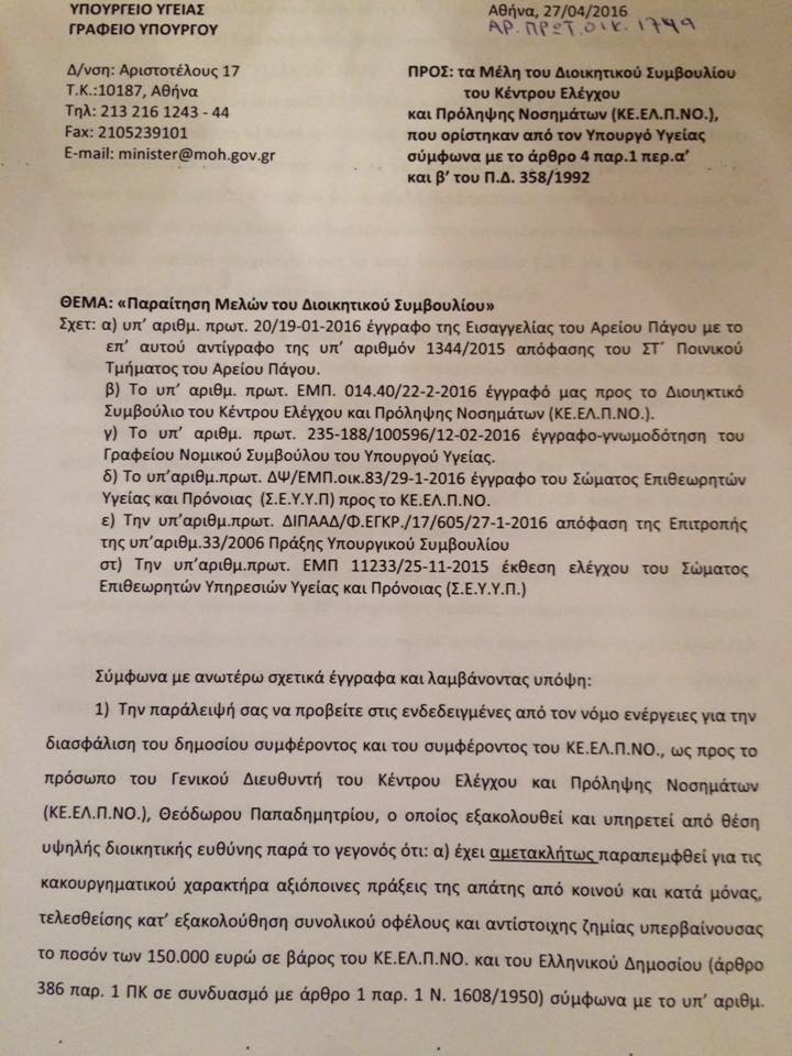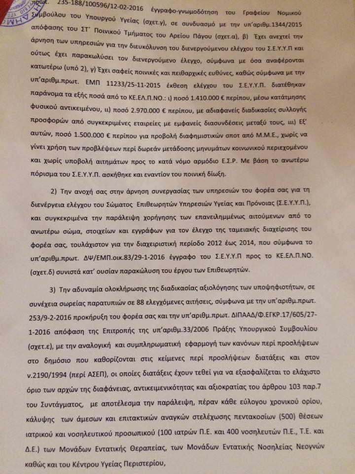 Με το έγγραφο, το οποίο παρατίθεται πιο κάτω, ο κ. Πολάκης εγκαλεί τα μέλη του συμβουλίου ότι παρέλειψαν να προβούν στις ενδεδειγμένες από τον νόμο ενέργειες για τη διασφάλιση του δημοσίου συμφέροντος και του συμφέροντος του ΚΕΕΛΠΝΟ.