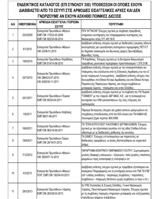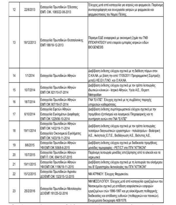 Ο αναπληρωτής υπουργός κατέθεσε στον αντεισαγγελέα, τον παρακάτω ενδεικτικό κατάλογο 23 υποθέσεων (σε σύνολο 350), οι οποίες έχουν διαβιβαστεί από το 2009 έως και το 2015, από το Σώμα Επιθεωρητών Υπηρεσιών Υγείας και Πρόνοιας (ΣΕΥΥΠ) στις αρμόδιες εισαγγελίες.