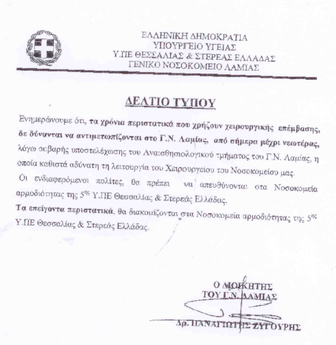 Έδωσε, δε, εντολή σε δύο αναισθησιολόγους του νοσοκομείου Άμφισσας να εκτελέσουν μέσα στον μήνα Νοέμβριο αριθμό εφημεριών στο νοσοκομείο Λαμίας για τους ίδιους λόγους.