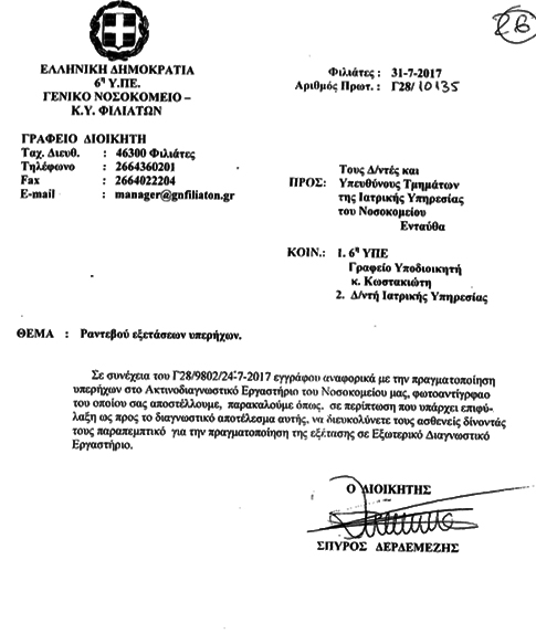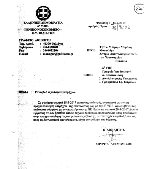 Η διευθύντρια του Ακτινοδιαγνωστικού Εργαστηρίου εγγράφως ενημέρωσε τον διοικητή ότι δεν δύναται με τον εν λόγω υπερηχογράφο να πραγματοποιεί ασφαλείς διαγνώσεις.