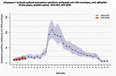 Οι επιστήμονες σημειώνουν πως έως και την περασμένη εβδομάδα οι επισκέψεις σε ιατρό για γριπώδη συνδρομή βρίσκονταν σε χαμηλά επίπεδα.