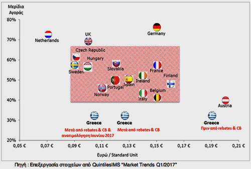 Οι περισσότερες χώρες της Ευρωπαϊκής Ένωσης – σημειώνει – τοποθετούνται σε μία περιοχή που οριοθετείται μεταξύ τιμών από 0,10 €/SU (μονάδα στοιχειώδους συσκευασίες) έως 0,17 €/SU και επίπεδα διείσδυσης από 40% έως 65%.