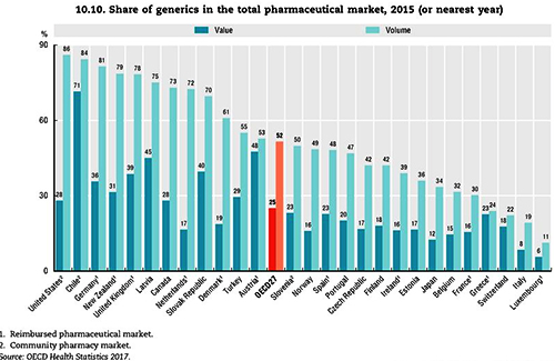 Τα αντίγραφα φάρμακα στη χώρα μας καλύπτουν το 23% της αξίας του συνόλου των φαρμάκων που καταναλώνονται και το 24% των συσκευασιών. Η Ελλάδα είναι η μόνη χώρα του ΟΟΣΑ, στην οποία το ποσοστό της δαπάνης για γενόσημα είναι περίπου ίσο με τις χορηγούμενες ποσότητες. Οι παρακάτω αριθμοί είναι εύγλωττοι: