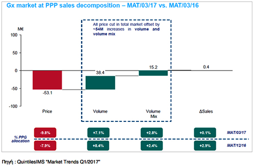 Το γράφημα της IMS που ακολουθεί δείχνει ότι οι όποιες πρόσκαιρες εξοικονομήσεις από την μείωση των τιμών των γενοσήμων του 2016 (-53,1 εκατ. ευρώ) εξανεμίστηκαν από την επίδραση του αυξημένου όγκου (+38,4 εκατ. ευρώ) και της μετατόπισης της κατανάλωσης σε νεότερα ακριβότερα φάρμακα που μεταβάλουν (προς το ακριβότερο) το προϊοντικό μίγμα (15,2 εκατ. ευρώ), με αποτέλεσμα την αύξηση της δαπάνης κατά 0,4 εκατομμύρια.