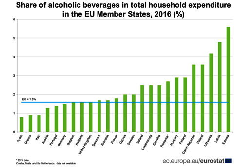 Όπως προκύπτει από τα πρόσφατα στοιχεία της Ευρωπαϊκής Στατιστικής Υπηρεσίας (Eurostat), στην πρώτη θέση βρίσκεται η Εσθονία, όπου το 5,6% του συνολικού εισοδήματος διατίθεται για αλκοόλ. Έντονα αυξητική τάση παρατηρείται στην Κύπρο και στην Τσεχία.