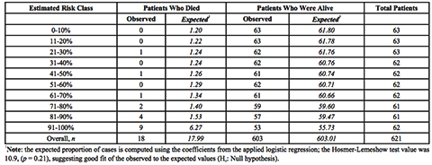 Ο παρακάτω πίνακας αξιοποιεί τα δεδομένα του εν λόγω λογισμικού και συγκρίνει την προβλεπόμενη και την καταγραφείσα θνησιμότητα καρδιοχειρουργικών περιστατικών στο Ωνάσειο.
