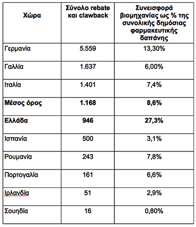 Η κατάσταση είναι πολύ χειρότερη όταν συγκρίνονται τα ποσοστά. Στην Ελλάδα, η συμμετοχή της φαρμακοβιομηχανίας στη συνολική δημόσια φαρμακευτική δαπάνη ανέρχεται στο 27,3%.