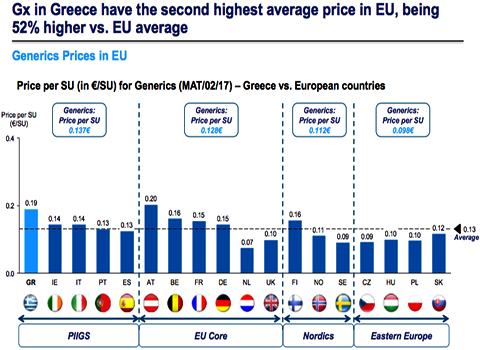 Στις τιμές των γενοσήμων, η Ελλάδα κατέχει τη δεύτερη υψηλότερη θέση (0,19 ευρώ) έπειτα από την Αυστρία (0,20 ευρώ), ενώ βρίσκεται αρκετά πιο πάνω από τη μέση ευρωπαϊκή τιμή, που είναι 0,13 ευρώ ανά SU.