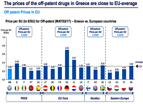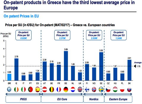 Στα εκτός προστασίας πατέντας φάρμακα, η Ελλάδα έχει τιμές κοντά στον μέσο ευρωπαϊκό όρο (0,26 ευρώ ανά SU, έναντι μέσου όρου 0,31 ευρώ).