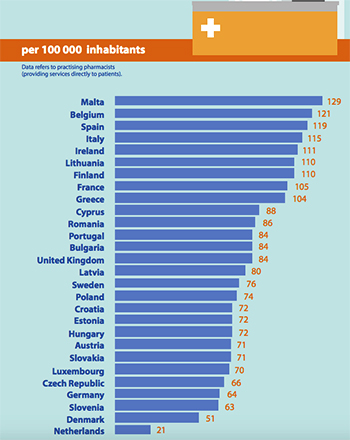 Σύμφωνα με τα στοιχεία, τα οποία αφορούν το 2015, οι περισσότεροι αναλογικά "φαρμακοποιοί πάγκου" εργάζονται στη Μάλτα (129 ανά 100.000 κατοίκους) και ακολουθούν το Βέλγιο (121 ανά 100.000), η Ισπανία (119), η Ιταλία (115), η Ιρλανδία (111), η Λιθουανία και η Φινλανδία (110), η Γαλλία (105) και ακολουθεί η Ελλάδα με 104 φαρμακεία ανά 100.000 κατοίκους.