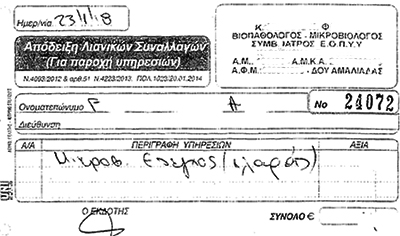 Απευθύνθηκε σε ιδιωτικό μικροβιολογικό εργαστήριο, όπου έκανε την εξέταση, για την οποία κατέβαλε το αντίτιμο (40 έως 50 ευρώ κοστίζει στα ιδιωτικά εργαστήρια) και έλαβε και την παρακάτω απόδειξη πληρωμής.