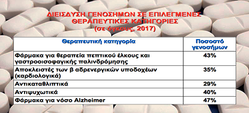 Πάνω από τον μνημονιακό στόχο είναι η διείσδυση των γενοσήμων στα φάρμακα για τη θεραπεία του πεπτικού έλκους και της γαστροοισοφαγικής παλινδρόμησης (43%), ενώ υψηλά ποσοστά καταγράφονται στα αντιψυχωσικά (40%) και στους αποκλειστές αδρενεργικών υποδοχέων (35%).