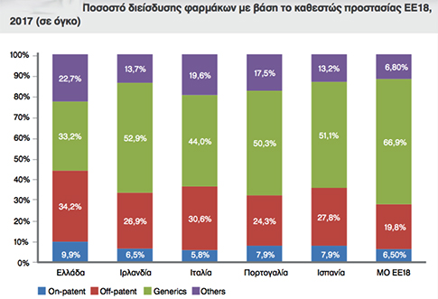 H διείσδυση των μη προστατευμένων φαρμακευτικών προϊόντων (off patent και γενοσήμων) στην Ελλάδα ανέρχεται συνολικά στο 67,4% (34,2% και 33,2%, αντίστοιχα). Τα off patent διατίθενται περισσότερο στη χώρα μας σε σχέση με τον μέσο ευρωπαϊκό όρο (19,8%).
