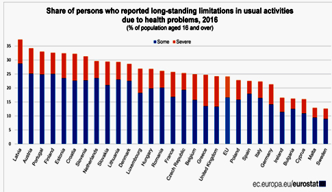 Σύμφωνα με τα στοιχεία του 2016, το 24,1% των Ευρωπαίων άνω των 16 ετών ανέφεραν προβλήματα στη διεκπεραίωση των δραστηριοτήτων τους, εξαιτίας μακροχρόνιων προβλημάτων υγείας.