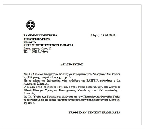Με το Δελτίο Τύπου, που παρατίθεται πιο κάτω, ο κ. Βαρδαρός ενημερώνει για το ποιός είναι ο νέος πρόεδρος της ΕΛΕΓΕΙΑ, παραθέτοντας και ορισμένα ευνοϊκά σχόλια για την παρουσία του στην Πρωτοβάθμια Φροντίδα Υγείας.