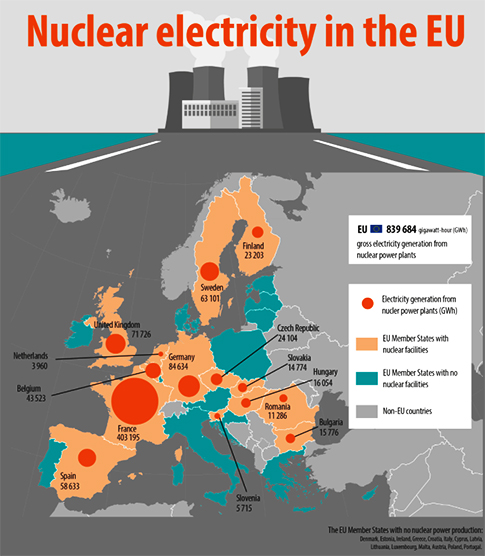 Βέλγιο, Βουλγαρία, Τσεχία, Γερμανία, Ισπανία, Γαλλία, Ουγγαρία, Ολλανδία, Ρουμανία, Σλοβενία, Σλοβακία, Φινλανδία, Σουηδία και Ηνωμένο Βασίλειο έχουν στο έδαφός τους πυρηνικά εργοστάσια παραγωγής ηλεκτρικής ενέργειας.