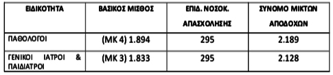 Για τους παθολόγους, ο βασικός μισθός είναι 1.894 ευρώ και για τους γενικούς γιατρούς και παιδιάτρους 1.833 ευρώ.