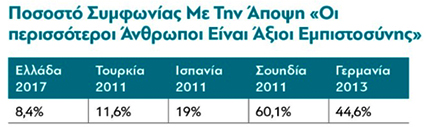 - Εννέα στους δέκα διαφωνούν με την άποψη ότι "οι περισσότεροι άνθρωποι είναι άξιοι εμπιστοσύνης".