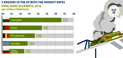 Σύμφωνα με τα στοιχεία, τη θλιβερή πρωτιά κατέχει η περιοχή Severozapaden της Βουλγαρίας, όπου καταγράφονται 153 νεκροί ανά εκατομμύριο πληθυσμού. Ακολουθεί η πορτογαλική περιοχή Alentejo (142 νεκροί) και το Λουξεμβούργο (138 νεκροί).