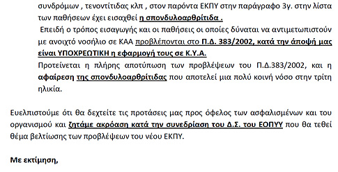Άρα, σημειώνει ο ίδιος, το συγκεκριμένο Π.Δ θα έπρεπε να αποτυπωθεί πλήρως στο νέο ΕΚΠΥ, καθώς δεν δύναται να τροποποιηθεί με Κοινή Υπουργική Απόφαση και ιδίως όσον αφορά τις παθήσεις που μπορούν να αντιμετωπίζονται στα Κ.Α.Α.